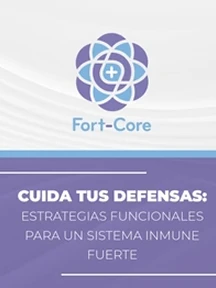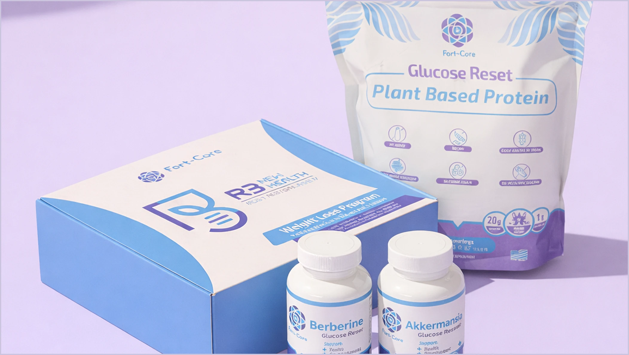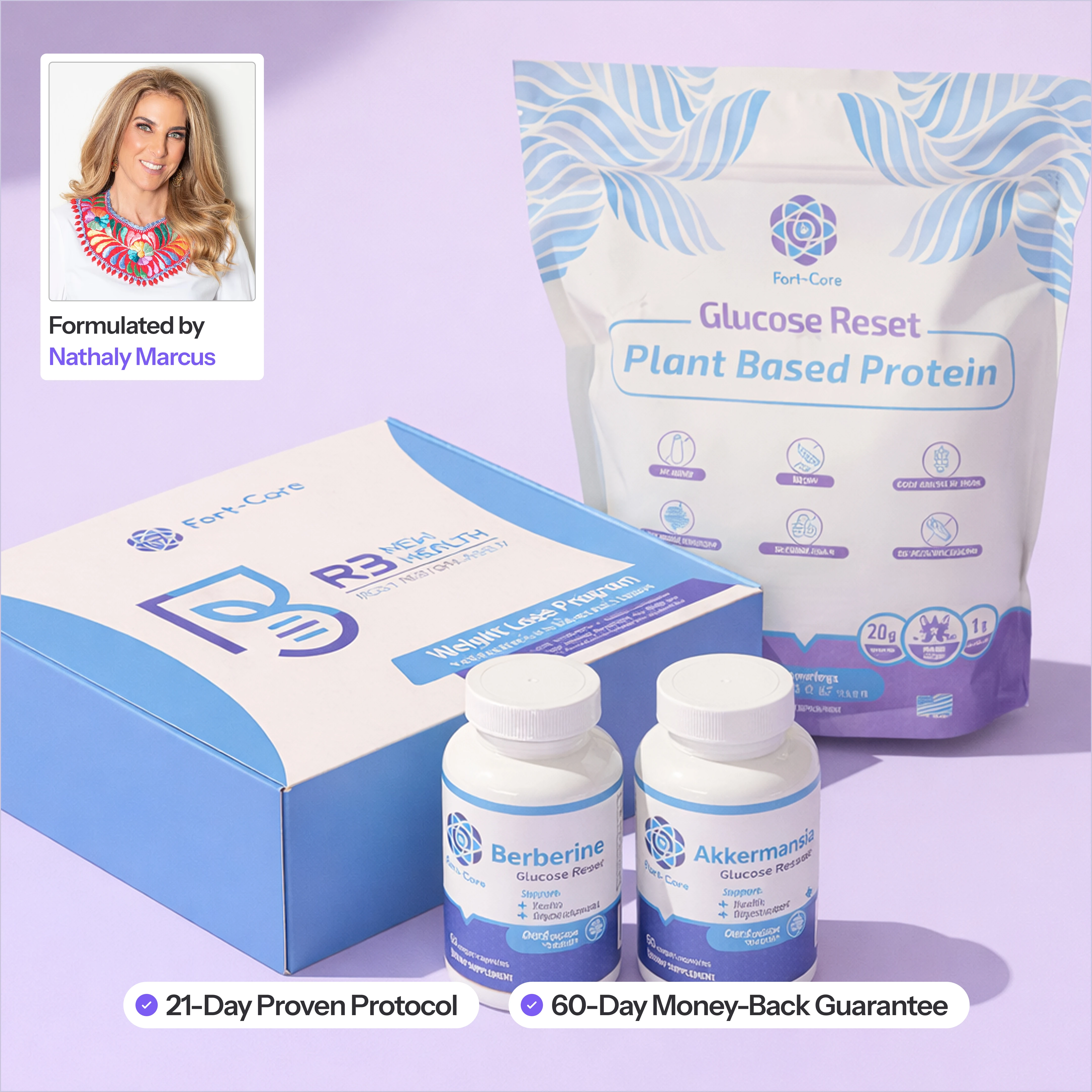 A collection of Fort-Core health products including protein powder, supplements, and a program box on a purple background.